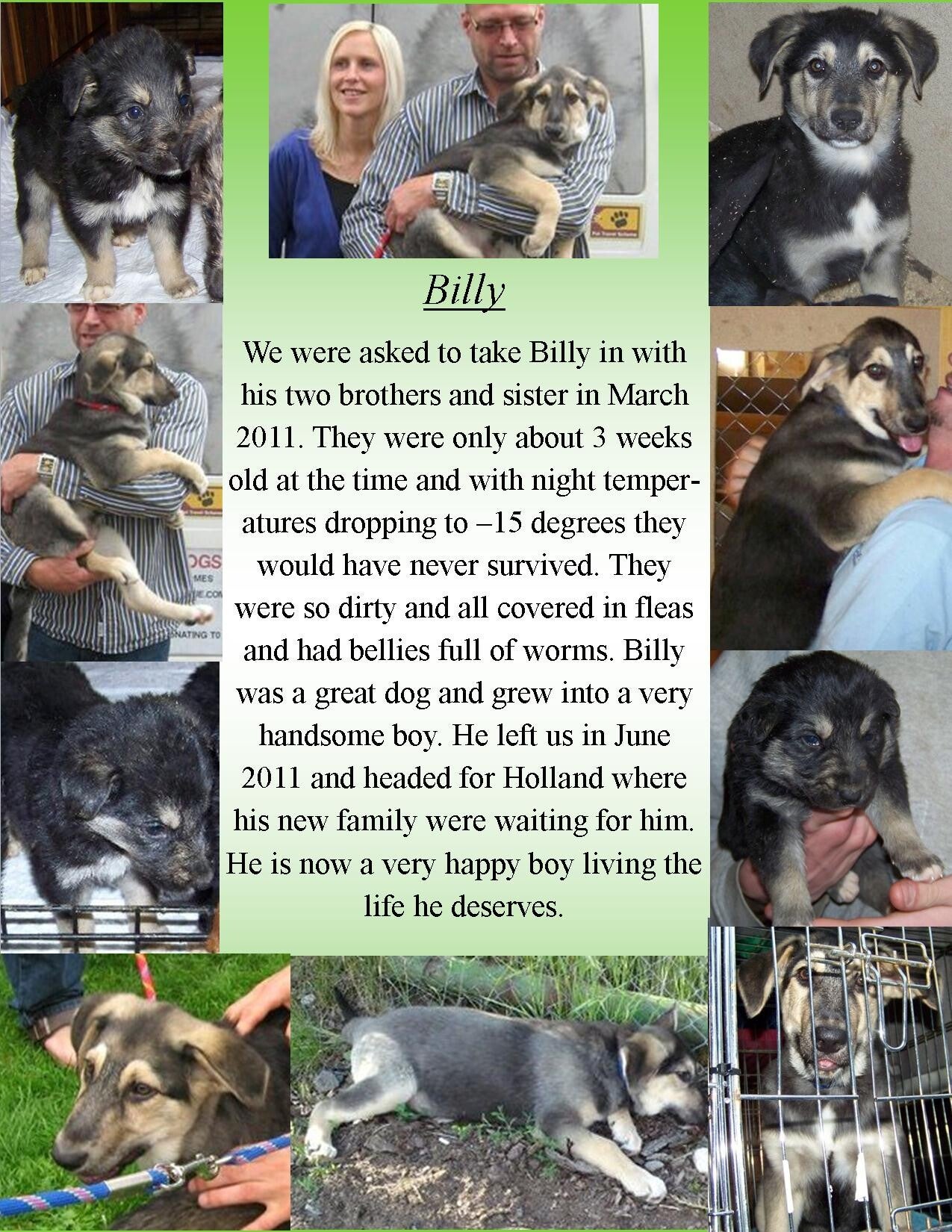 Op 11/12 maart 2011 bracht iemand 4 kleine pups van ongeveer 3 weken oud bij de opvang en vroeg of wij ze op konden nemen anders zou hij ze ergens dumpen. De pups zouden zeker de nacht niet hebben overleefd het was - 15 graden en lager.