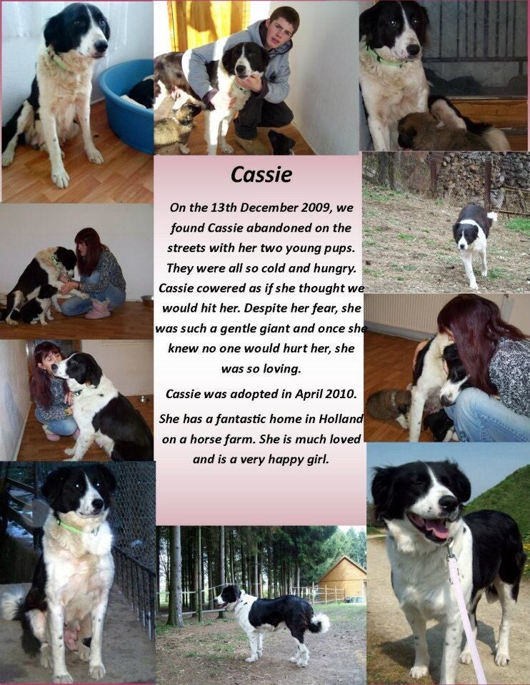 Op 13 december 2009 werd Cassie gevonden op straat samen met haar 2 kleine pups van ongeveer 5 weken oud. Cassie was duidelijk gedumpt en waarschijnlijk mishandeld zij was ontzettend bang maar niet agressief.