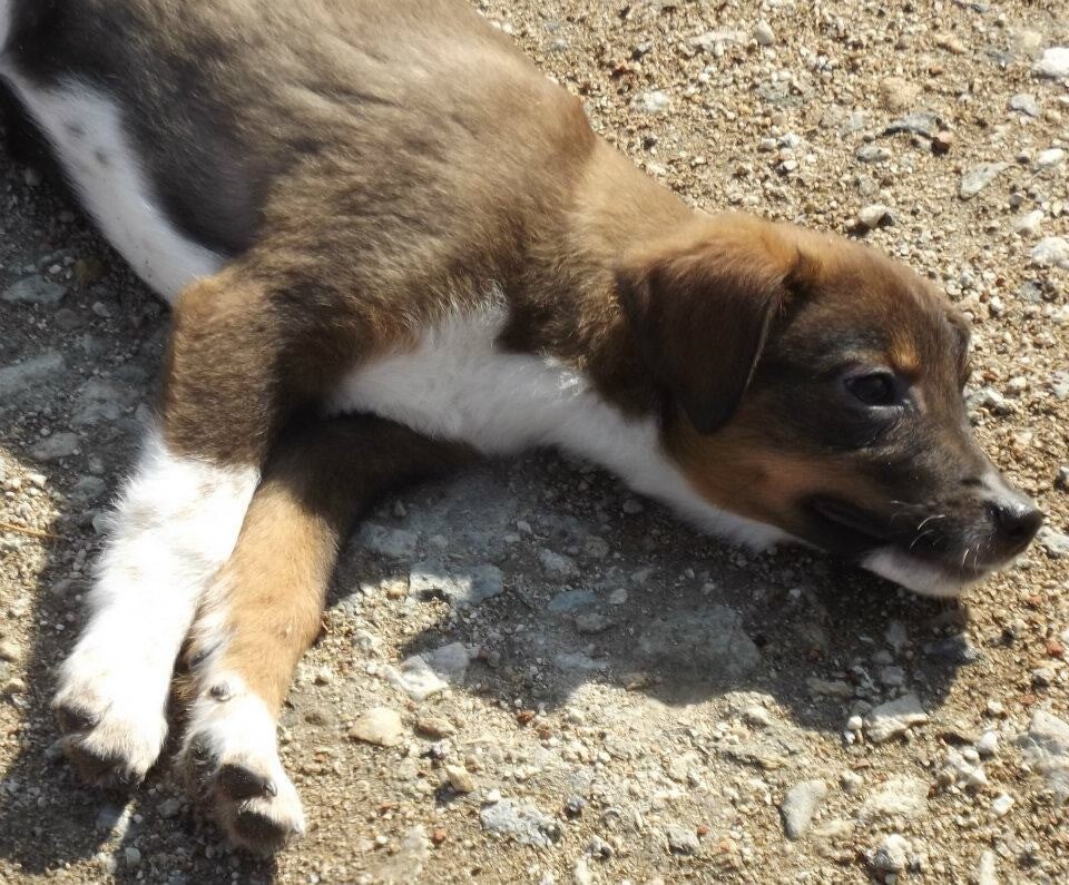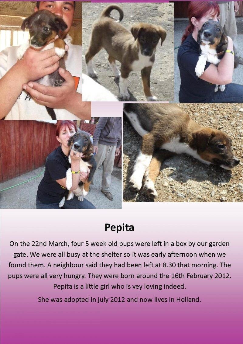 Pepita en nestgenootjes werden op 22 maart 2012 als hele jonge pups voor het huis gedumpt in een kartonnen doos, helaas hebben 2 pups het niet gered.