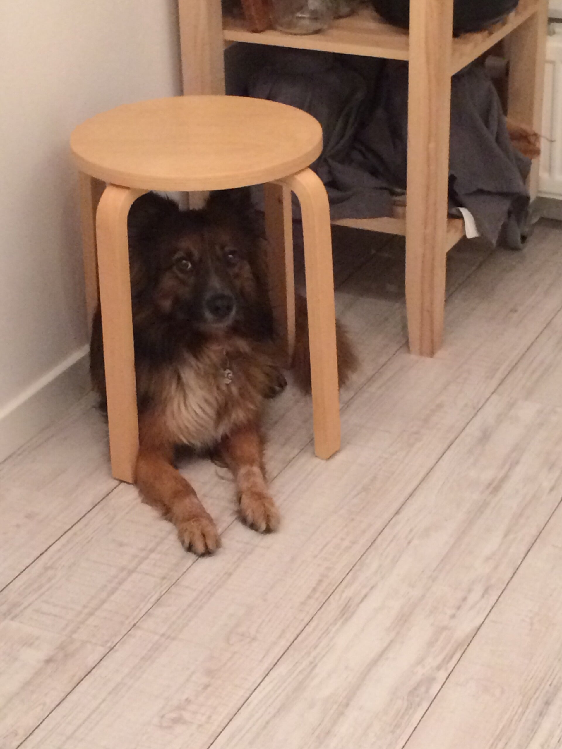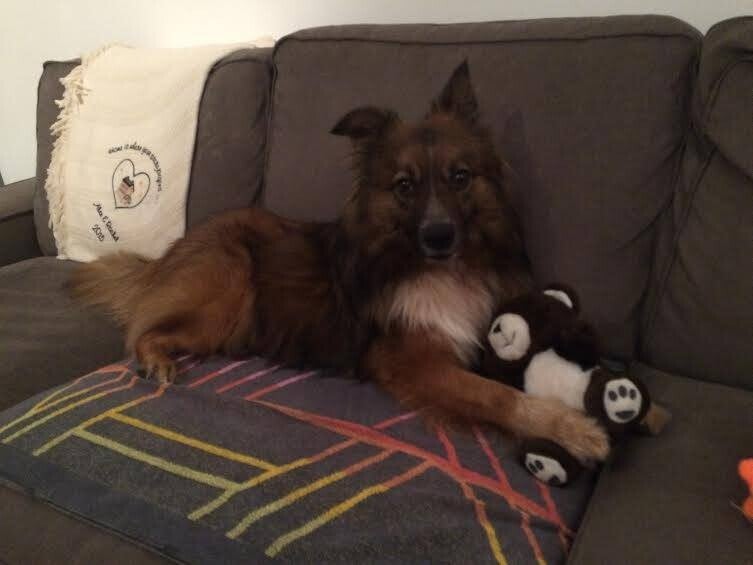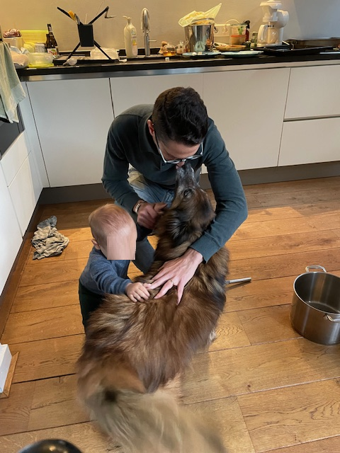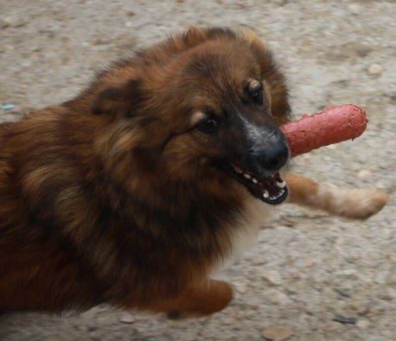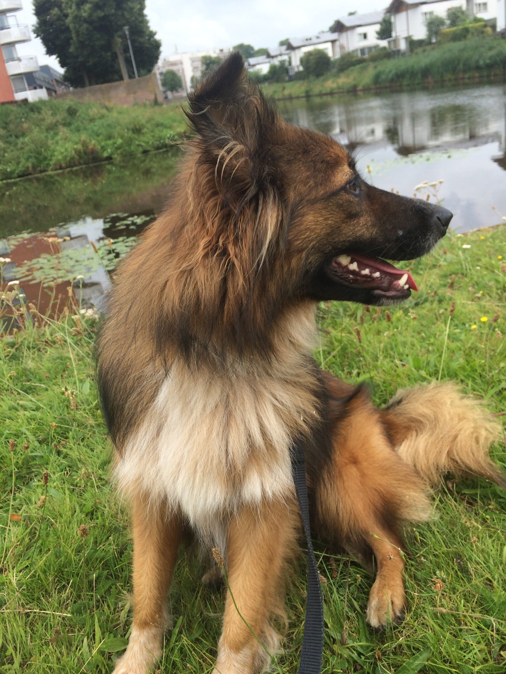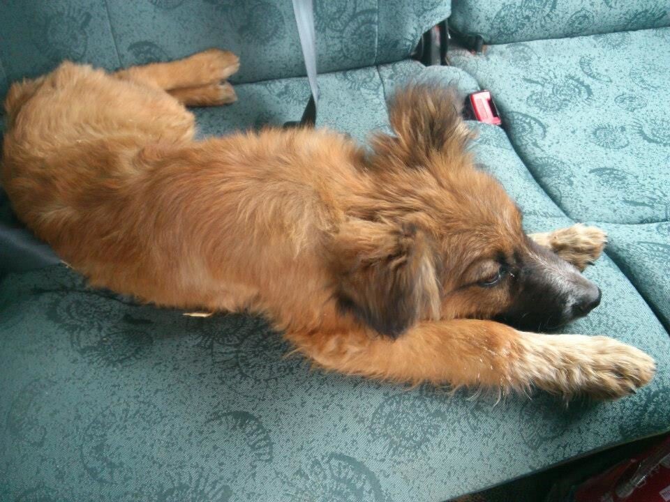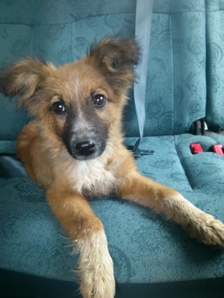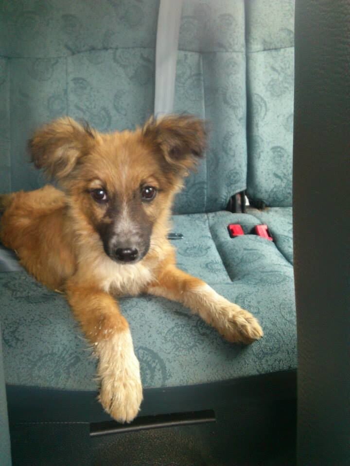 hongerig en op zoek naar restjes, maar dook ineen als mensen voorbij liepen. Hij was doorweekt er was duidelijk iets over hem heen gegooid. Toen hij eenmaal door had dat hij voor Tony geen angst hoefde te hebben sprong hij in de auto en nestelde zich op de achterbank, hij was een hele vriendelijke pup.