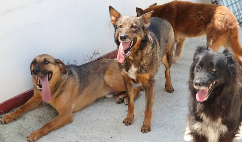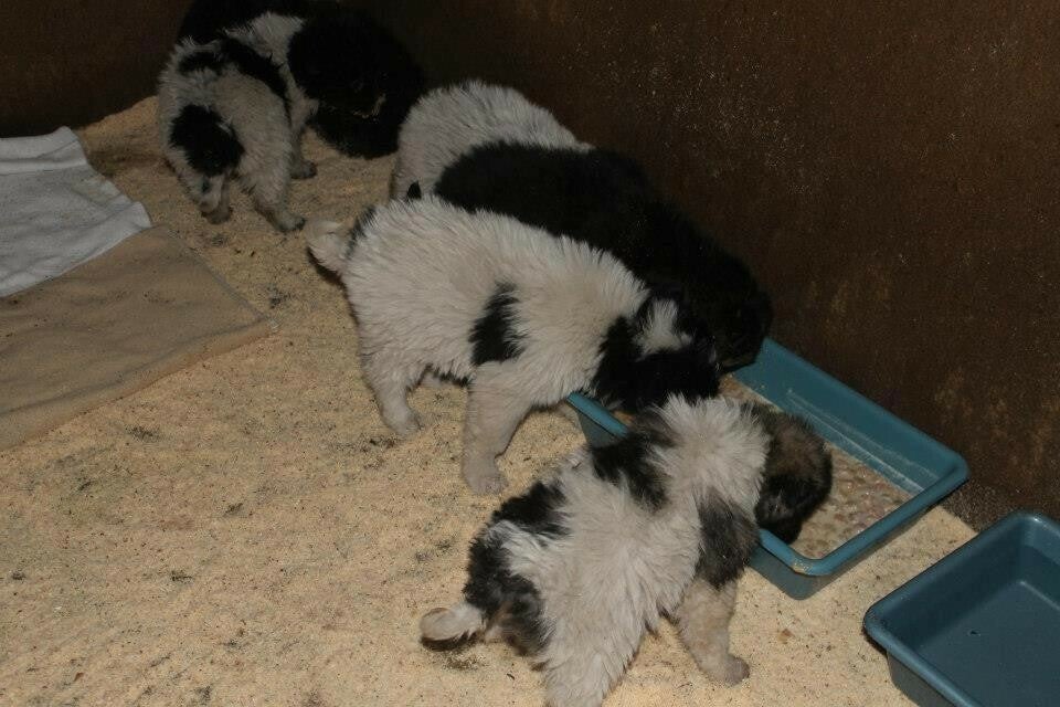 Toen wij daar aankwamen bleken er 10 pups rond te huppelen. Wij constateerden dat er niet 1 maar 2 nestjes gedumpt waren want de grootte van de pups was heel verschillend. De pups kropen angstig weg maar het lukte om ze allemaal te vangen. Er liepen op het terrein enkele Karakachan kruisingen en ons vermoeden is dat één van de teefjes en reutjes de ouders zijn.
