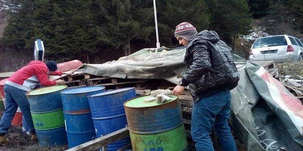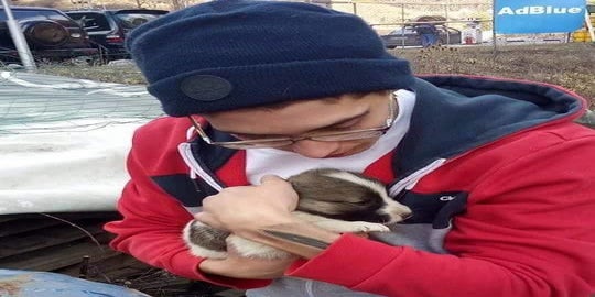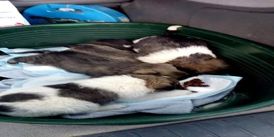 28 december 2016 Het was zo koud dat de rivier bevroren was. RSDR kreeg een telefoontje van een tankstation 2 uur rijden verderop of zij een moederhond met pups konden helpen. De moederhond is van de eigenaar van het tankstation en zij had haar pups gekregen onder een stapel pallets buiten. De pups waren hun moeder gaan volgen naar de benzinepomp.