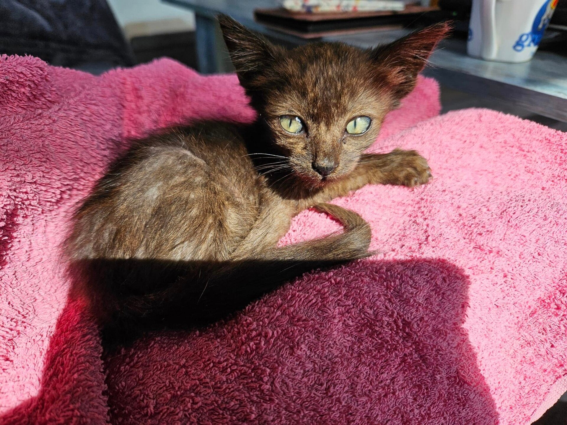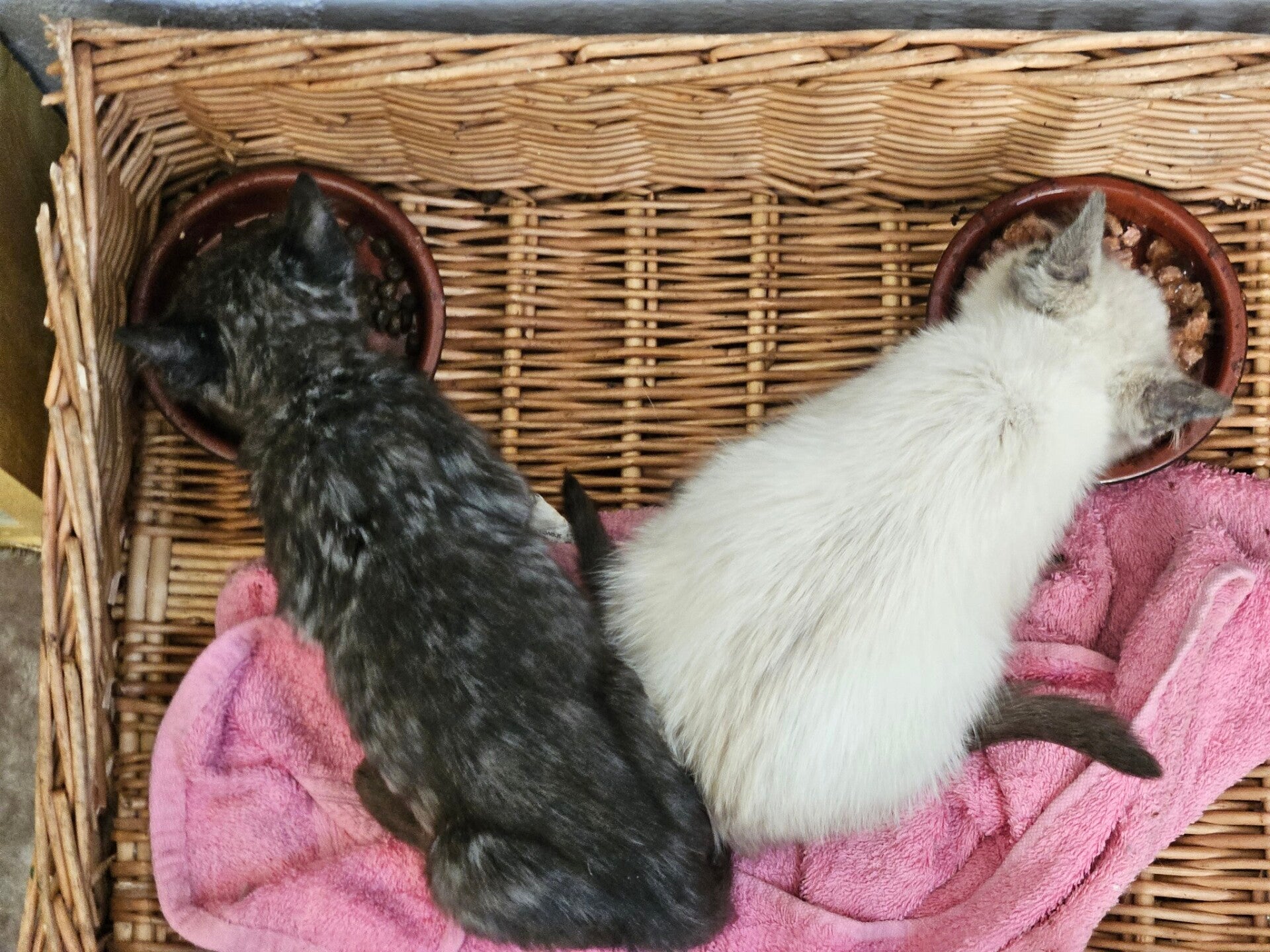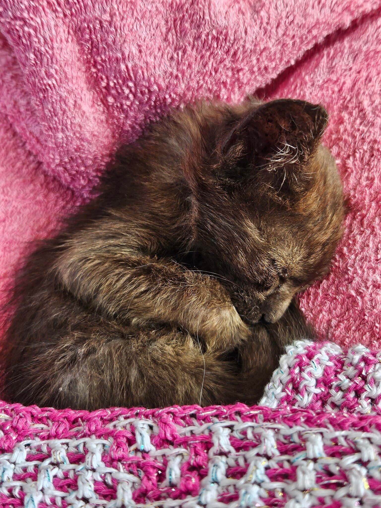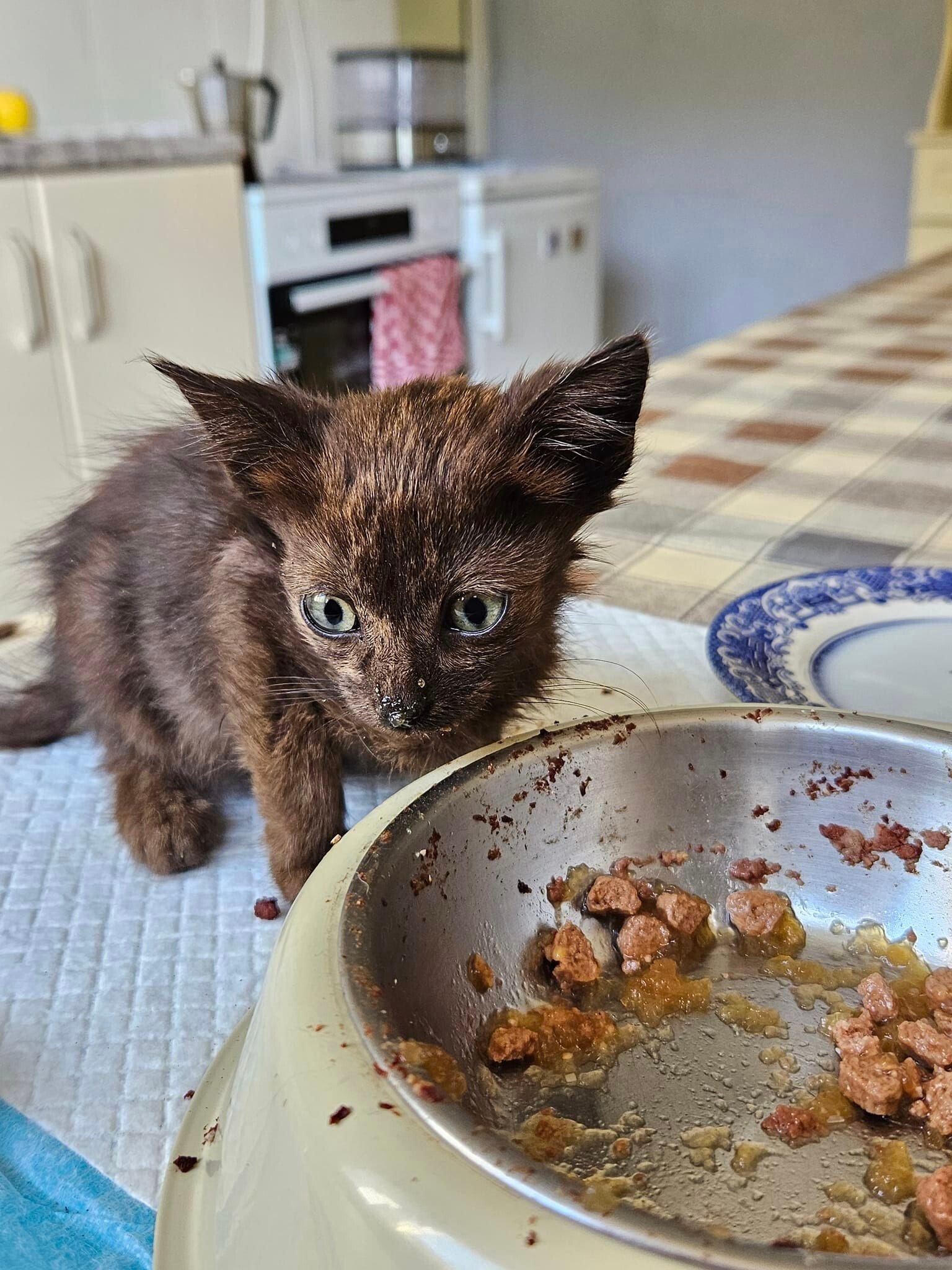 Tony vond Nugget terwijl hij naar eten zocht bij vuilnisbakken langs een drukke weg. Er was daar een nestje kittens geboren, toen Tony stopte om Nugget te voeren, hoorde hij dat Nugget’s nestgenootjes waren omgekomen in het verkeer. Dit raakte hem zo diep dat hij besloot Nugget mee naar huis te nemen. Het kleine katertje was mager en zat onder de vlooien, maar na wat rust, goede verzorging en genoeg eten bloeide hij helemaal op. Met zijn ondeugende karakter wist hij al snel ieders hart te veroveren. Nu verblijft Nugget in het asiel samen met de andere katten,