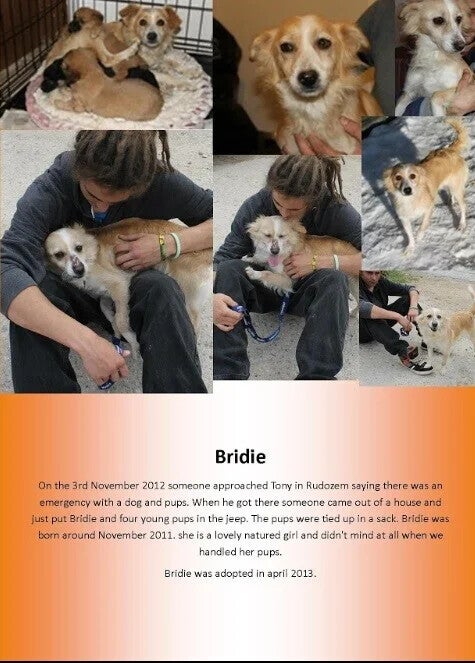 Toen Tony daar aankwam, kwam er iemand uit een huis en zette Bridie en een zak met vier jonge pups gewoon in de jeep.