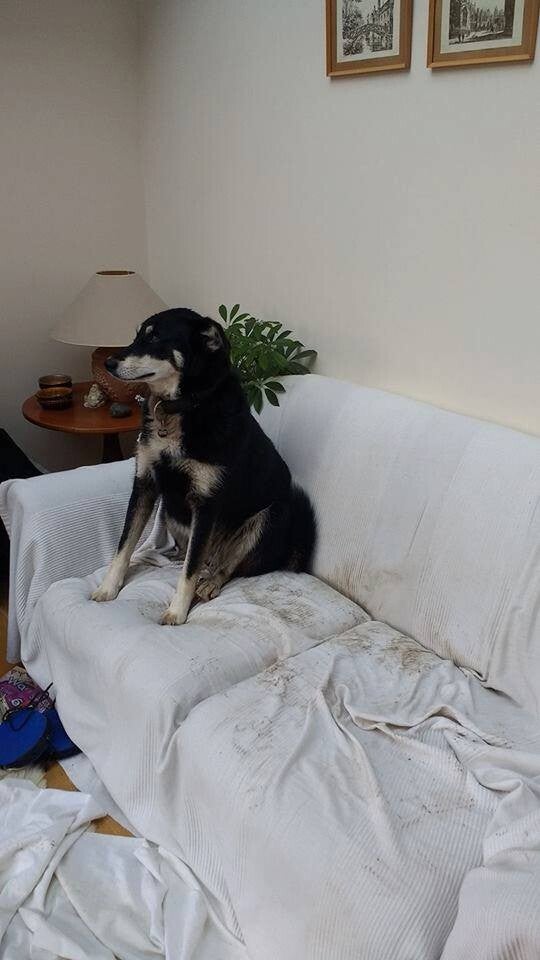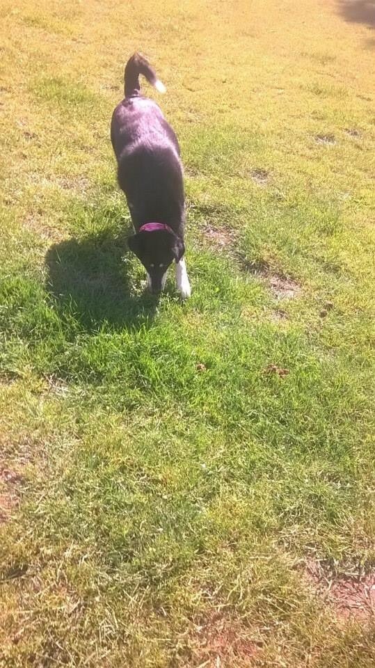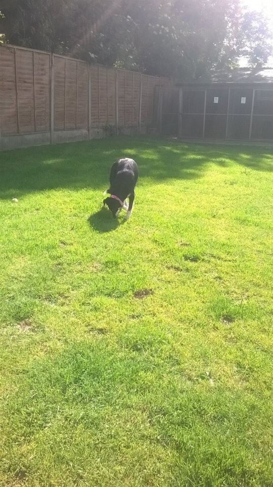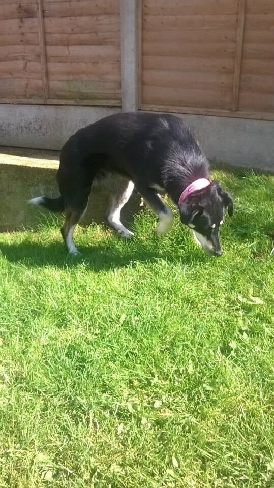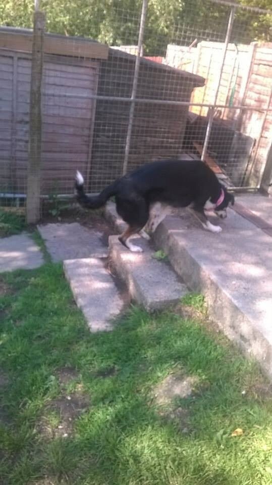 09-04-2014 hadden we afspraken in het ziekenhuis. Kerry merkte een hond op die op het ziekenhuisterrein lag. We gingen kijken en controleerden of de hond ok was. Ze was een beetje zenuwachtig maar kwam naar Sam en Nikita. We hebben gemerkt dat ze korstjes heeft van snijwonden op haar gezicht en op haar onderbuik toen ze op haar rug lag . We hebben ook gemerkt dat ze zwak is als ze loopt. We hadden haar een belofte gedaan dat aan het einde van ons bezoek aan het ziekenhuis we terug zouden komen voor haar en haar mee naar huis zouden nemen. Ze had echter andere ideeën en volgde ons overal. We liepen naar de auto en Sam maakte vrienden met haar voordat ze haar op tilde om haar in een bench te plaatsen in de auto. Deze hebben we altijd in de auto voor noodgevallen.