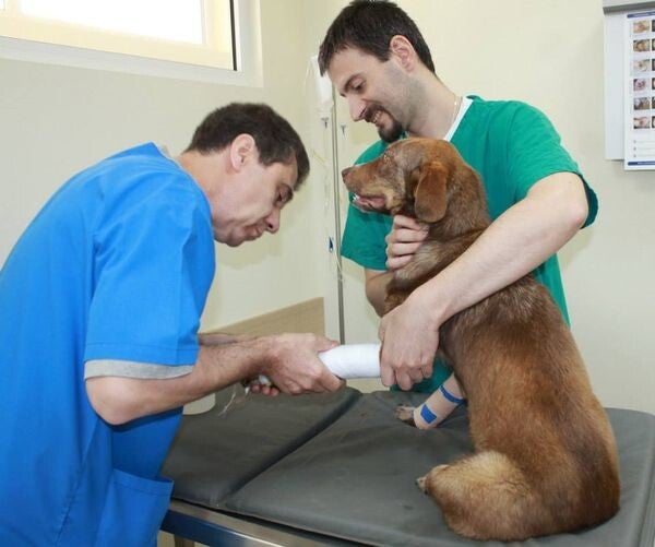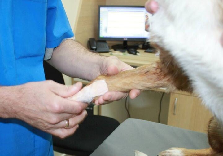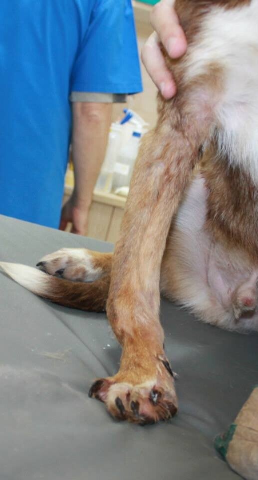 Hij was vel over been en timide. Zijn voorpoten zijn ernstig misvormd, mogelijk als gevolg van een aangeboren aandoening of ondervoeding.