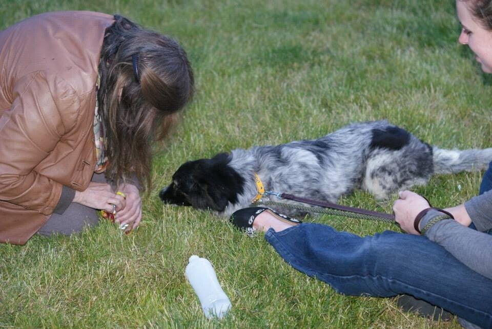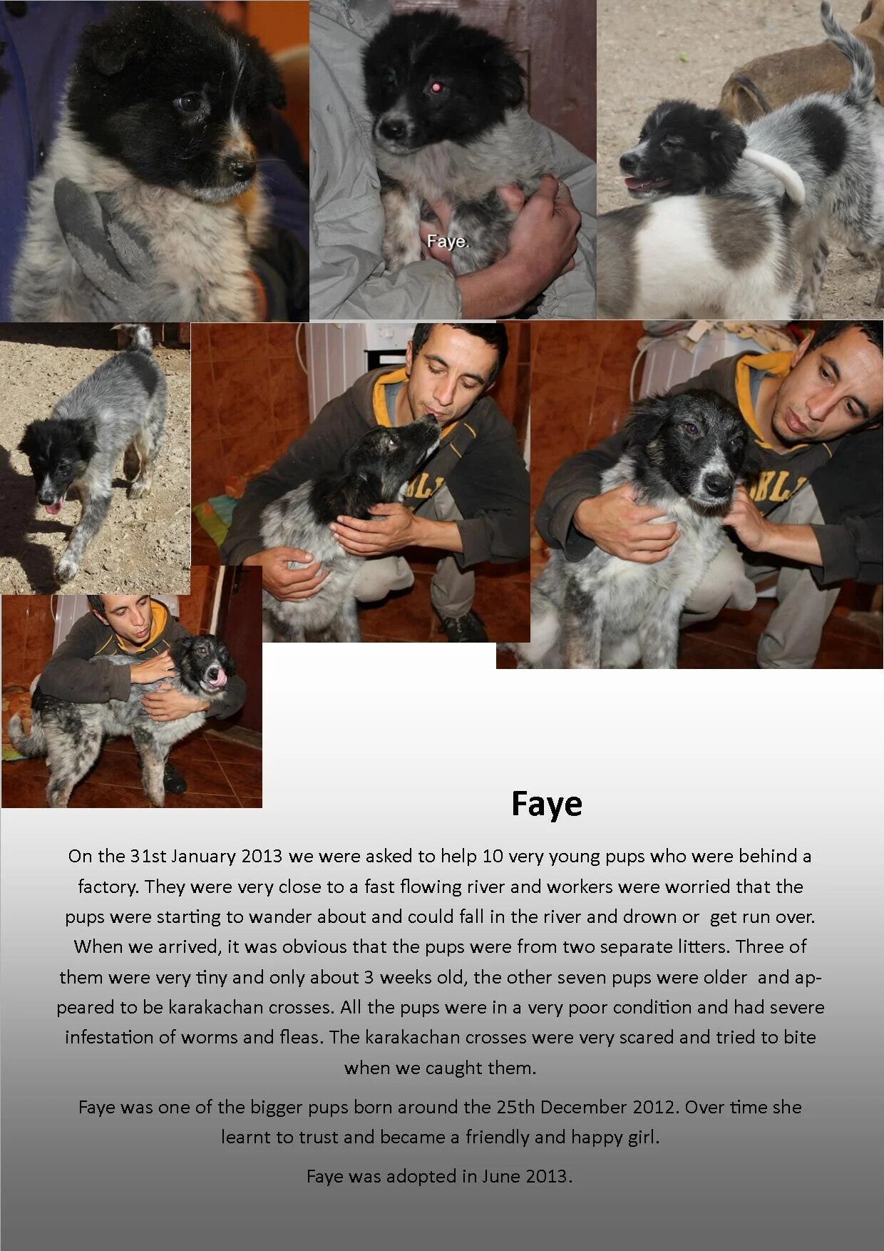 Toen wij daar aankwamen bleken er 10 pups rond te huppelen. Wij constateerden dat er niet 1 maar 2 nestjes gedumpt waren want de grootte van de pups was heel verschillend. De moeder van Faye is waarschijnlijk een 2e/3e generatie kruising Karakachan. Twee pups hebben het helaas niet gehaald en zijn overleden.