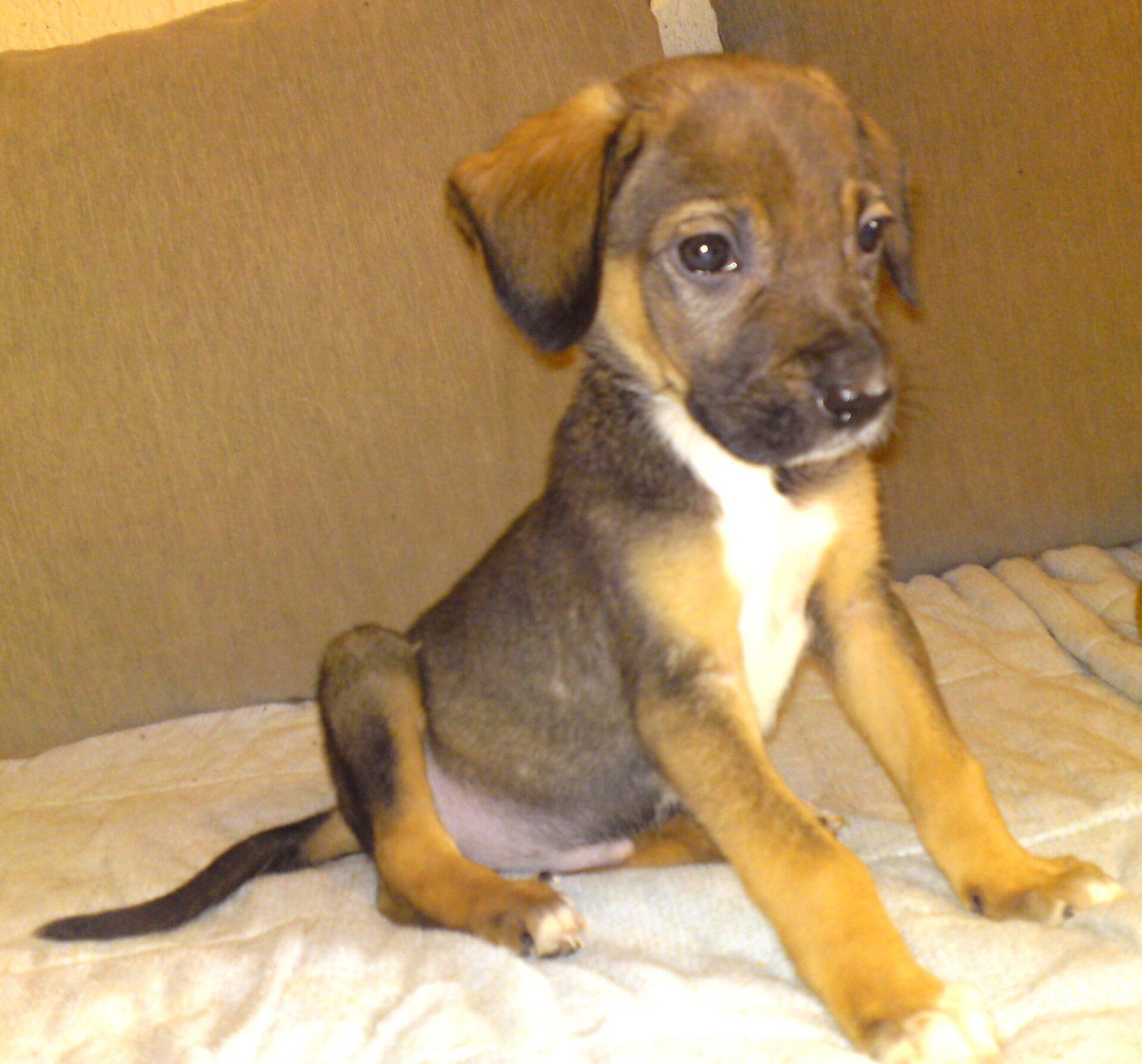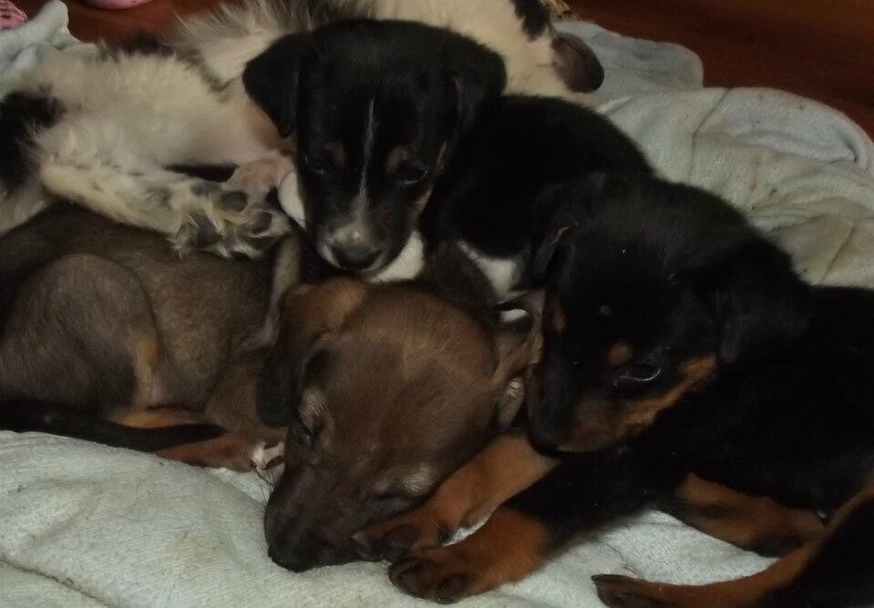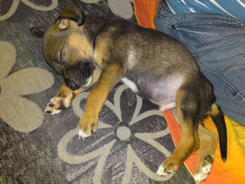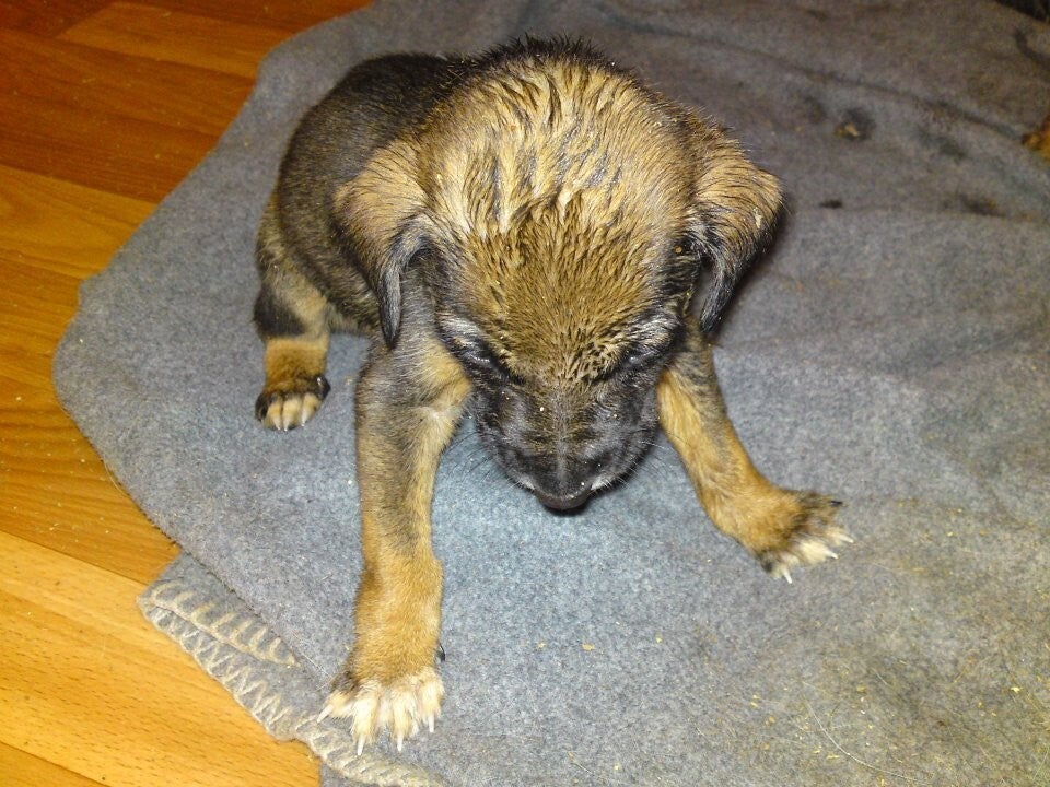 Hij werd achtergelaten in een doos in het bos, met zijn broers en zussen, ze hadden er al dagen gelegen voor iemand ons vertelde over hen op 26 april 2012. Het was heel koud s'nachts en gedurende de dag lagen ze in de brandende zon, zonder dat er iets te eten of te drinken. Twee van de pups waren al dood toen we ze vonden en 2 leefde nog, helaas hebben de anderen het niet overleefd Flanagan is de enige die het gered heeft. Flanagan was ingestort en uitgedroogd toen we hem vonden, had last van een zeer vervelende infectie die hem ook bijna doodde.