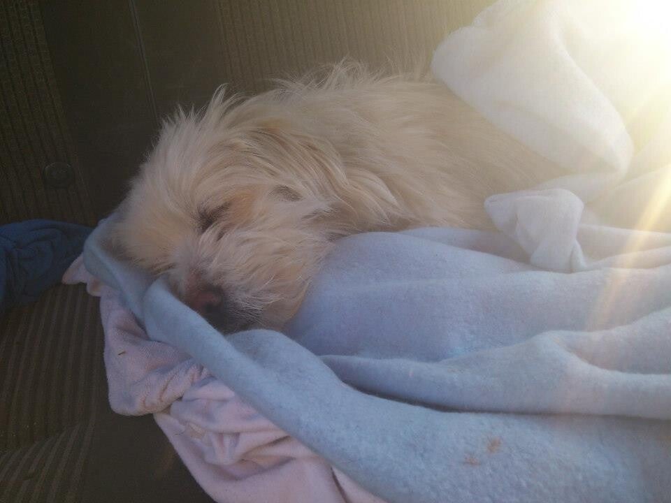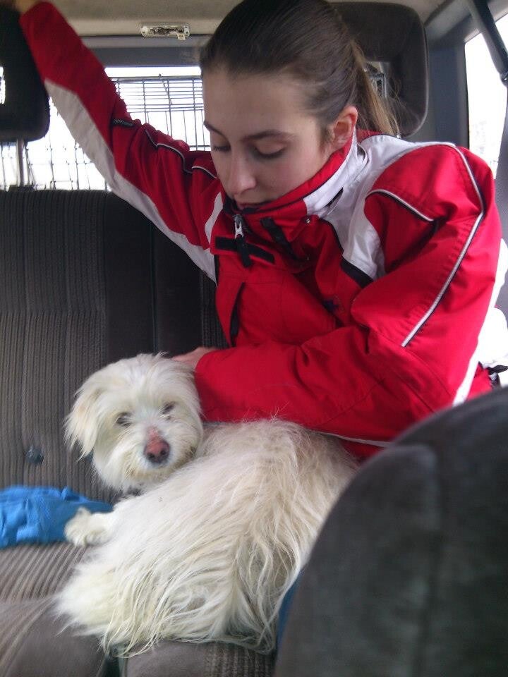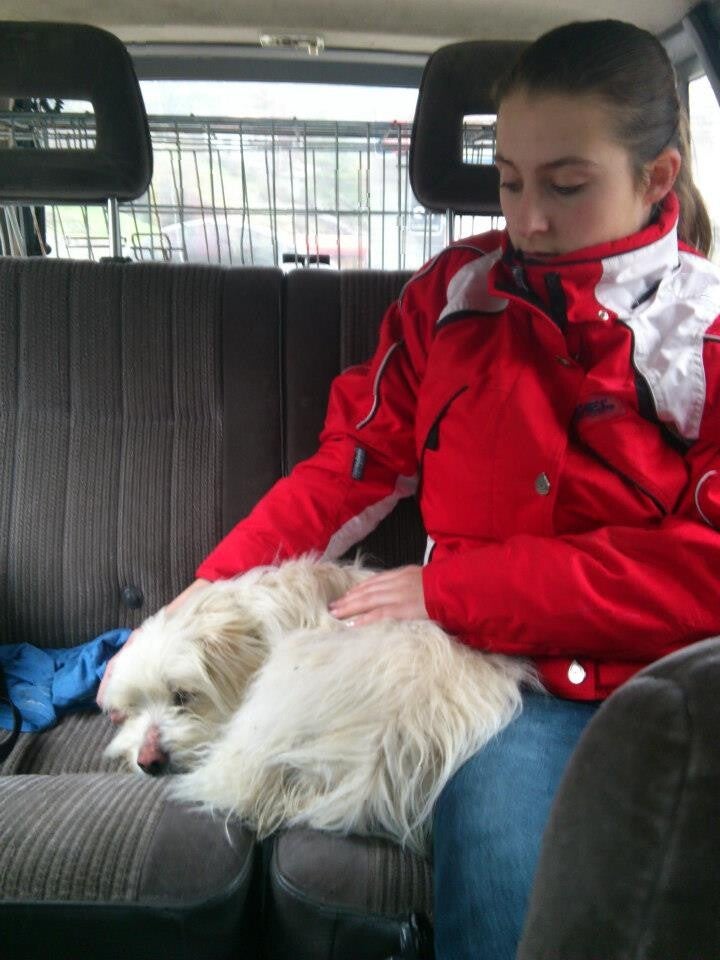 Bij de controlepost zagen we de kleine hond, ze wilde gelijk vrienden zijn, maar was nog steeds wat timide. Ze bevroor toen we haar gingen aanhalen, maar deed geen poging om te bijten. We besloten om haar op de achterbank van de auto te laten naast Kerry in plaats van dat ze in de bench moest. Het duurde niet lang voordat ze naast Kerry kroop en viel in slaap. Haar vacht is verschrikkelijk vuil, zit vol met klitten en knopen ook was ze bedekt met teken.