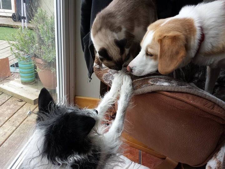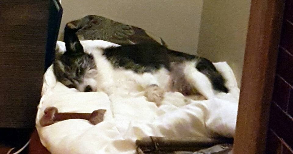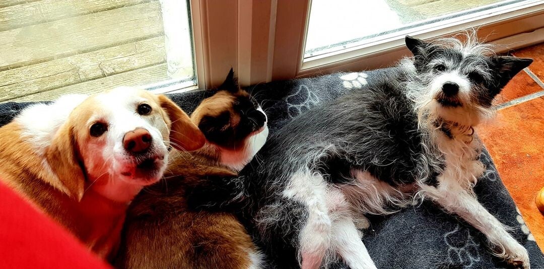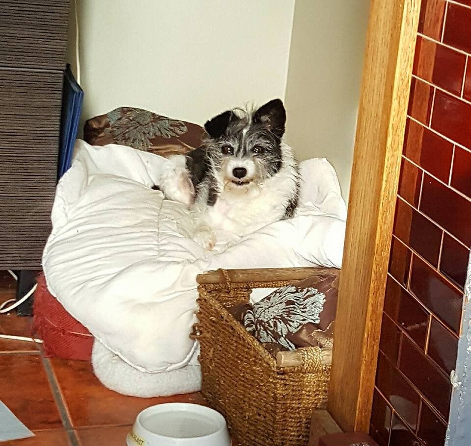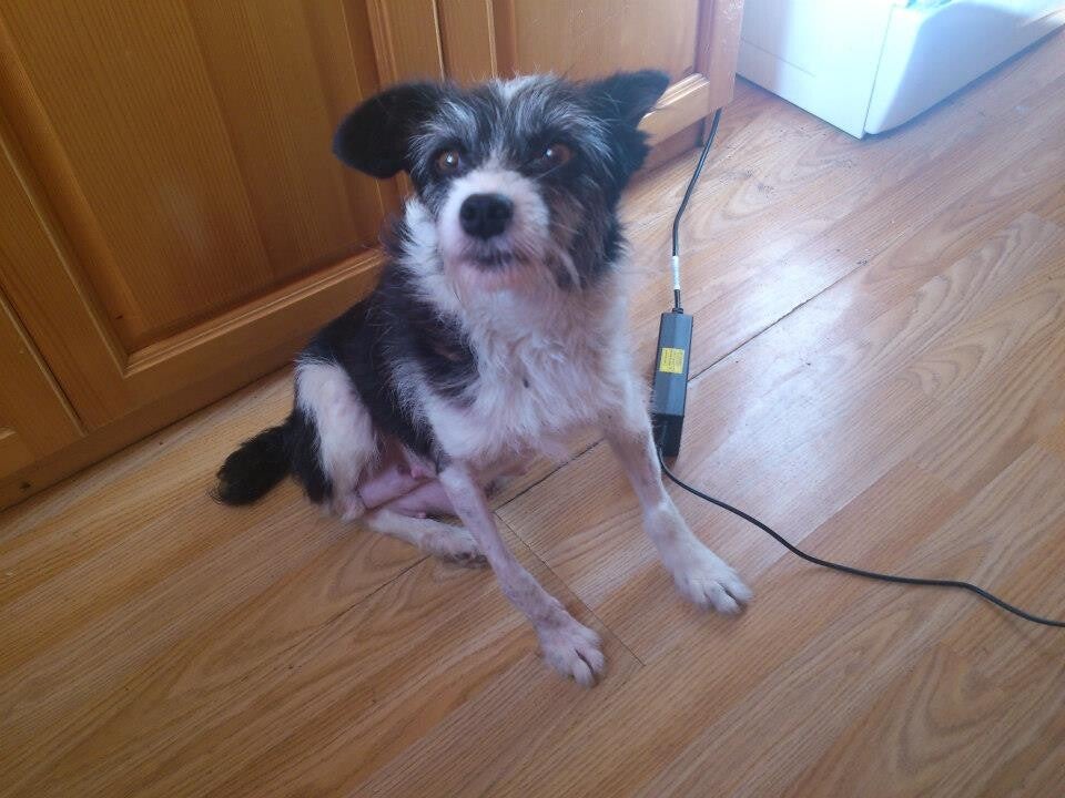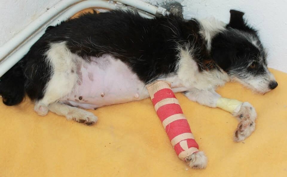 Lucy heeft 3 poten, ons is verteld dat ze aangereden was door een bus jaren geleden en geen medische hulp heeft gehad, zelf haar gebroken achterpootje heeft afgebeten.
