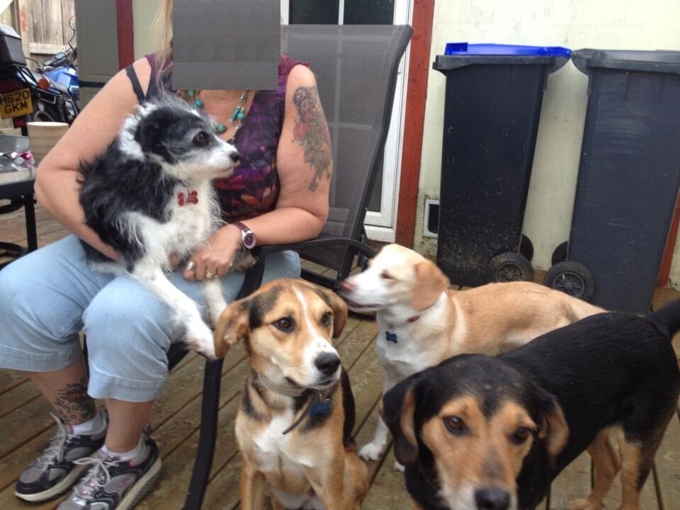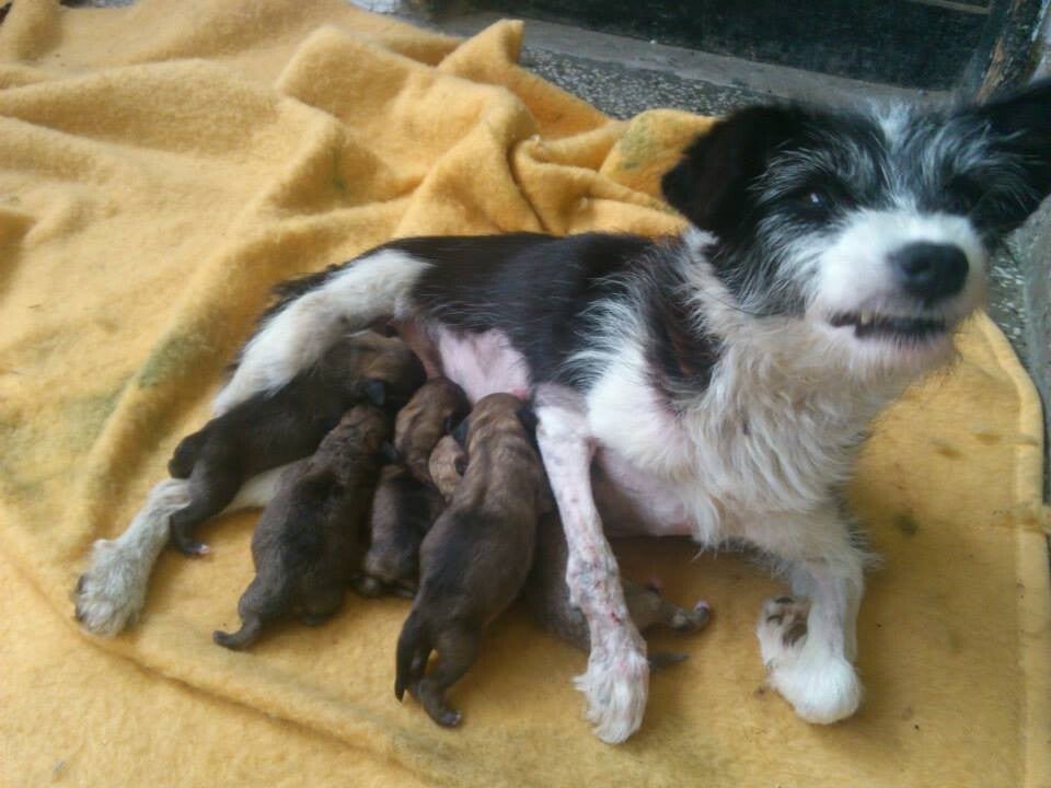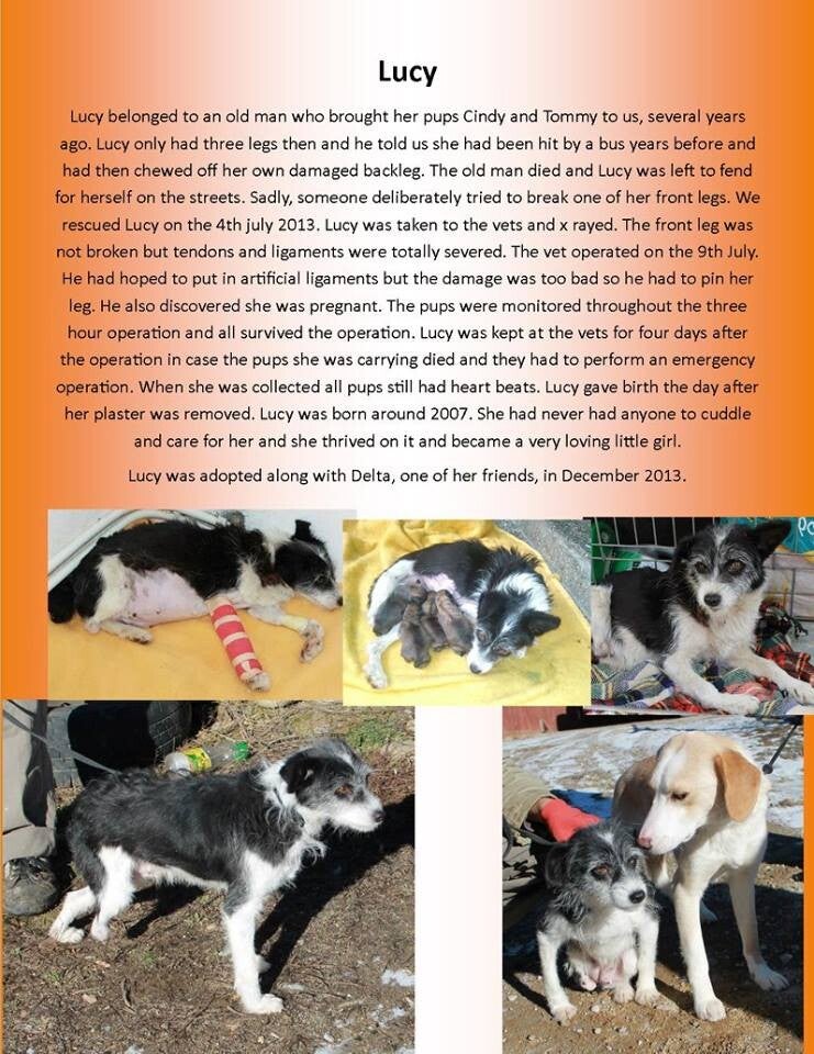 Haar oude baasje is overleden en zij werd alleen op straat gedumpt en moest voor zichzelf zorgen. op 4 juli 2013 kregen wij een bericht dat iemand moedwillig geprobeerd had om een ander voorpootje te breken. Wij hebben Lucy meegenomen naar de dierenarts en deze heeft röntgen foto's gemaakt, hieruit bleek dat haar pootje gelukkig niet gebroken was maar pezen en banden totaal waren afgescheurd. Haar pootje in via een operatie met pennen en schroeven vast gezet en kwam er toen achter dat zij ook nog eens zwanger was. Lucy en de pups zijn heel goed in de gaten gehouden door de dierenarts 4 dagen lang na de operatie, dat mocht een pup in haar overlijden dan zou er een spoed operatie volgen, 23 juli zijn haar pups geboren.