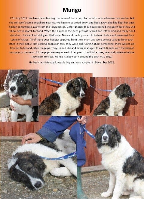 Mungo is met nestgenootjes gevangen in het centrum van Rudozem op 17 juli 2012. De moeder van de pups is een straathond