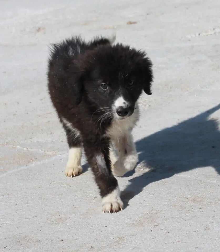 Op 6 oktober 2016 langs de weg naar de shelter in de vroege morgen ontdekten de jongens een kleine pup helemaal alleen aan de kant van de drukke weg. Hij was heel vuil en erg mager, zat vol met vlooien en had ontzettende honger.